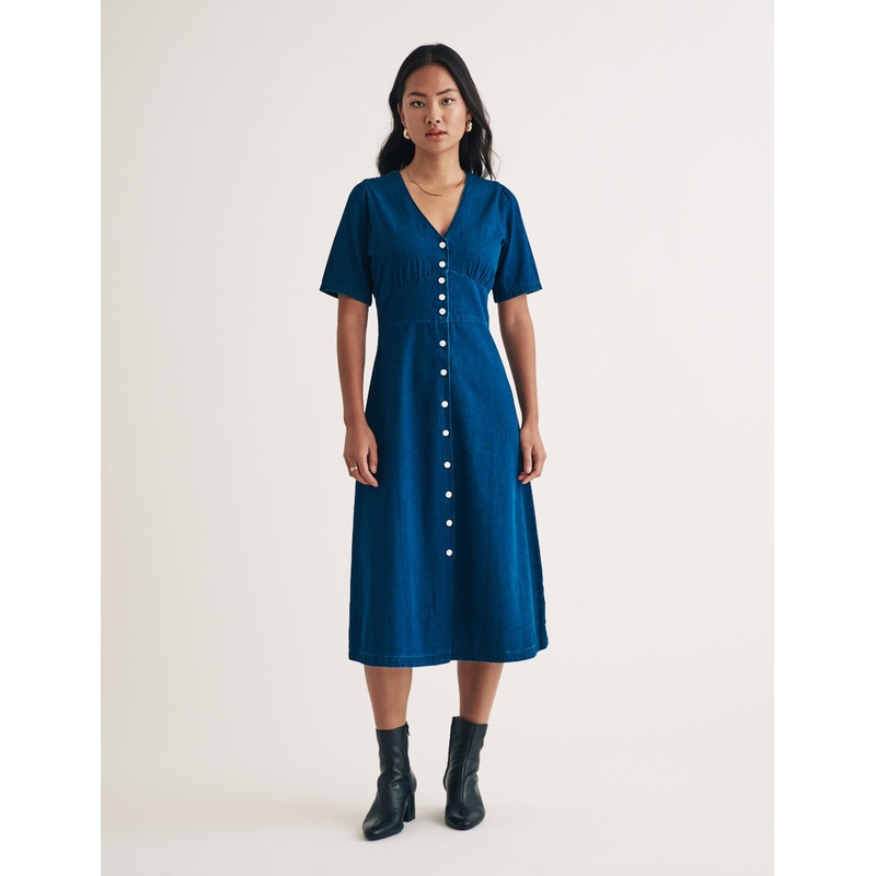 Our trophy style in a dark-wash denim. Alexa is all about the vintage-inspired details, from the timeless tea dress cut to the contrast white buttons and drapes like a dream. Team her with boots for a so-now look. Compliments are sure to follow.