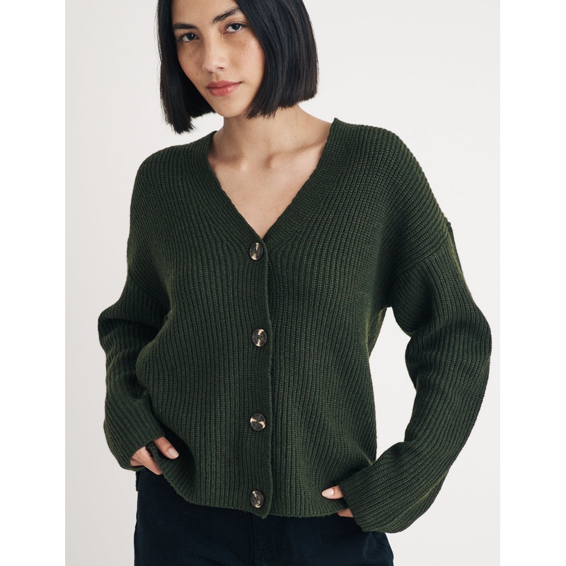 Cut for a flattering boxy fit, this cosy but still cute khaki cardigan is finished with chunky buttons. Wear with your favourite denim jeans.