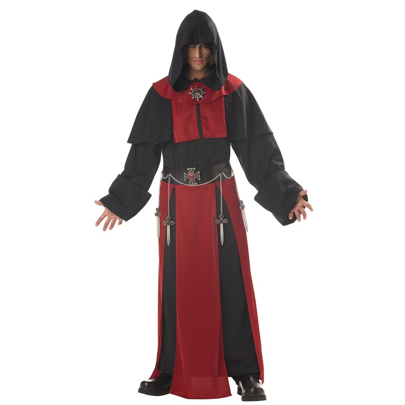 California Costume Men's Mayhem Mansion Dark Minion Halloween CostumeIncludes: Robe with attached hood and collar, Belt with attached drapes and crossesSize: Adult Medium (40-42" Chest/36" Waist), Adult Large (44-46" Chest/38" Waist)CS00920