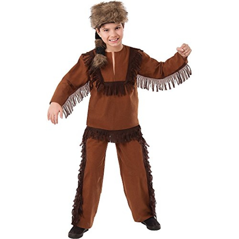 Includes: Brown shirt, pants and fauxraccoon skin cap.Size Child: S (4-6), M (8-10), L (12-14)