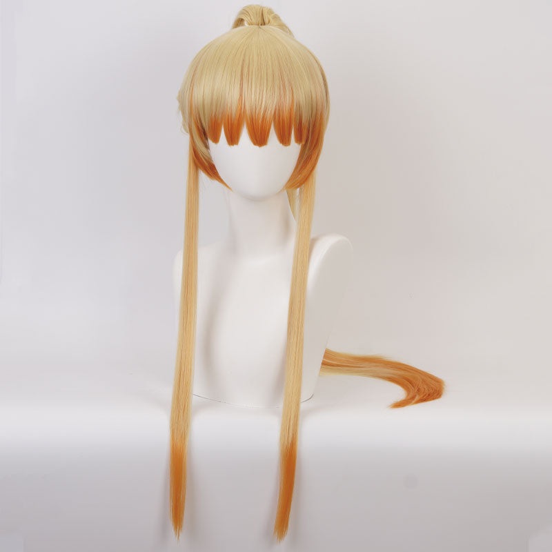 Demon Slayer: Kimetsu no Yaiba Zenitsu Agatsuma Long Ponytail Cosplay WigsSource:Demon SlayerCharacter:Zenitsu AgatsumaMaterial:Synthetic High Temp FiberLength: 80cm/31.5inchColor:Orange YellowCategory: Cosplay WigPackage:1pc wig +1pc free wig capCap Size: