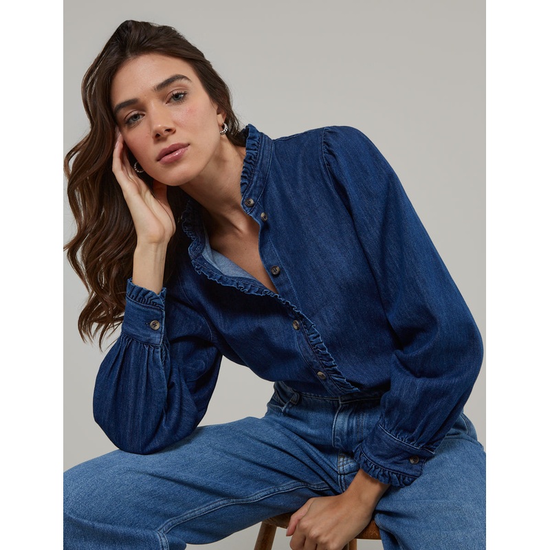 Where wouldnt you wear this denim blouse? Featuring an easy round neck and a button front, you can layer it up or layer down. We especially love the pretty frill detailing. Style yours with everything you already own. Long balloon sleeves Round neck Button