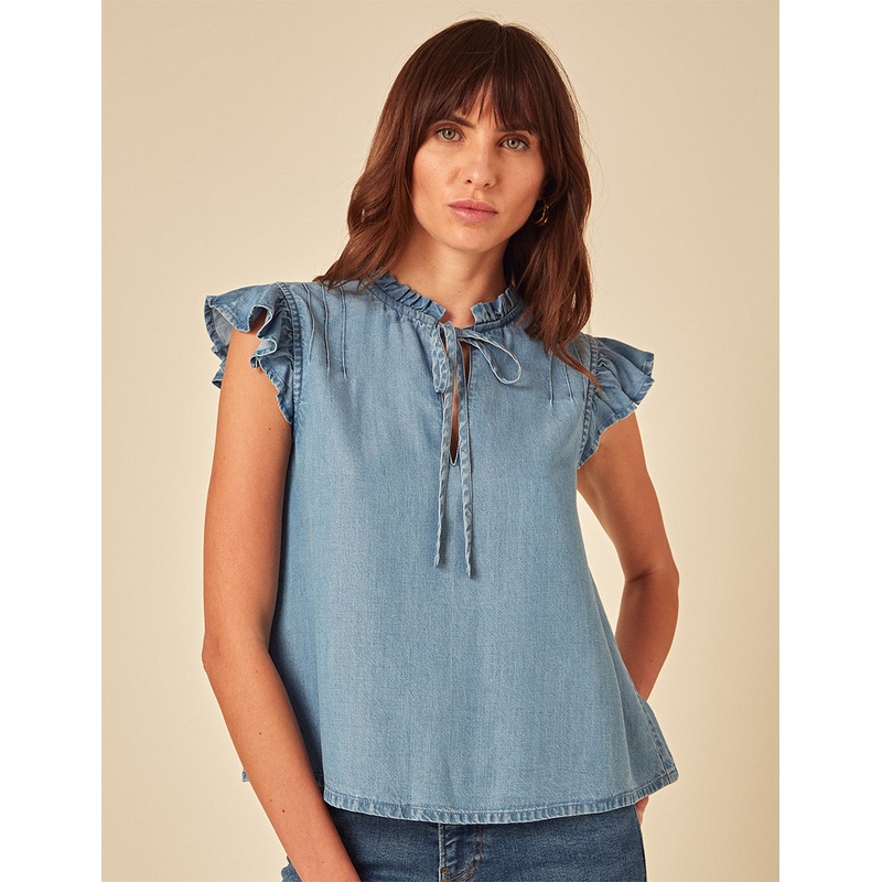 Top of the tops. Coming in a light wash denim, our ruffle-trim top is just so effortless. We love the tie detail at the neck too. Style with shorts for a double denim look.