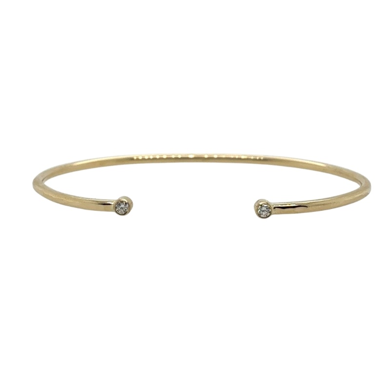 This 14 karat yellow gold Eleni Katina Diamond Embrace cuff bracelet features (2) round brilliant cut diamonds with quality characteristics of G-H color and SI1 clarity and a combined weight of 0.12 carat. The size is Medium.*This is handmade in house and