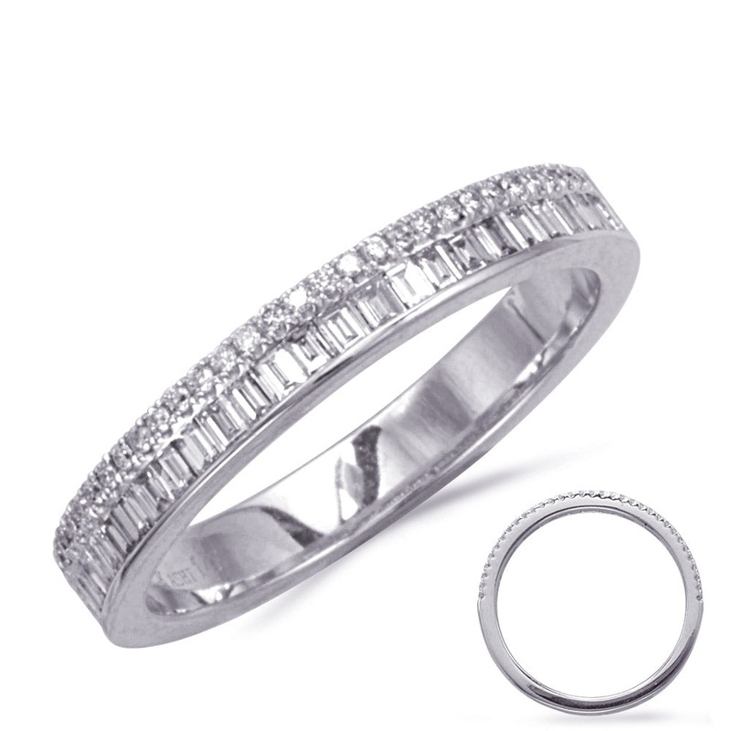 14K white gold band with 0.35cttw of baguette diamonds and 0.10cttw of round diamonds.