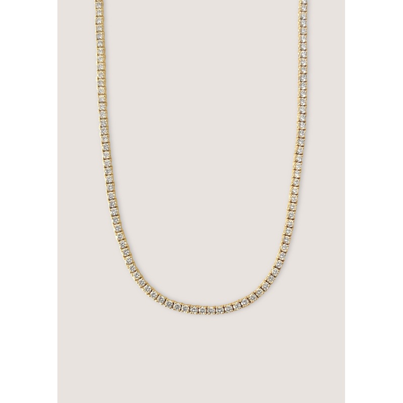 This classic tennis necklace features 2mm natural round diamonds four-prong set in 14k gold. Make a statement and wear Diana without anything else.14k solid goldalwaysWeight: 14.5gWidth: 2.18mmDiamond color: GDiamond clarity: VS2 SI1Box clasp with safetyAp