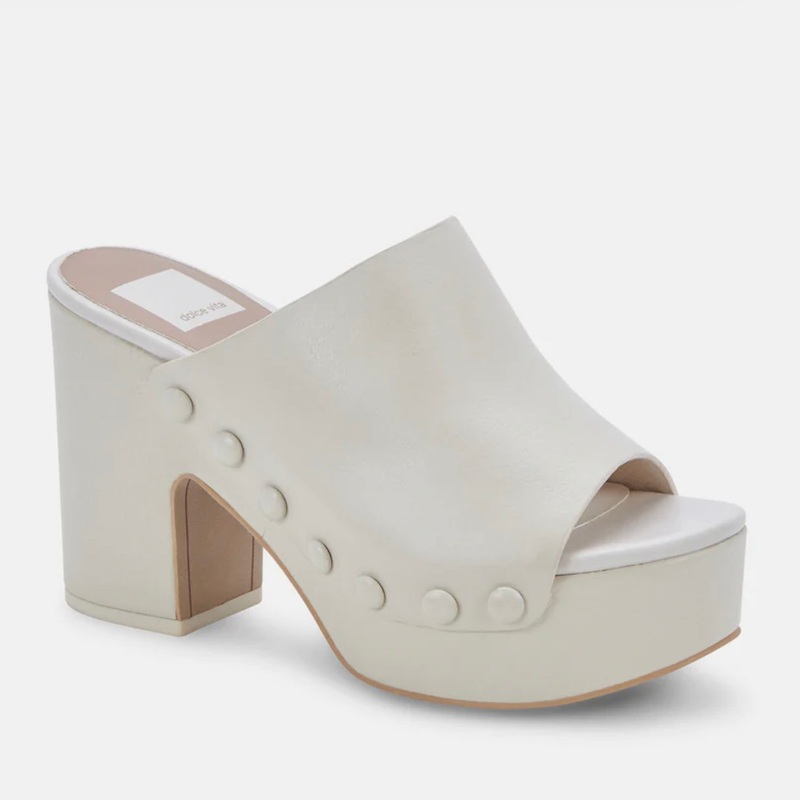 Dolce Vita Emol Heel in Ivory.Leather UpperRecycled Synthetic OutsoleRecycled Textile LiningWater-based Leather Alternative Sock4" Heel Height2" Platform HeightFits true to size.