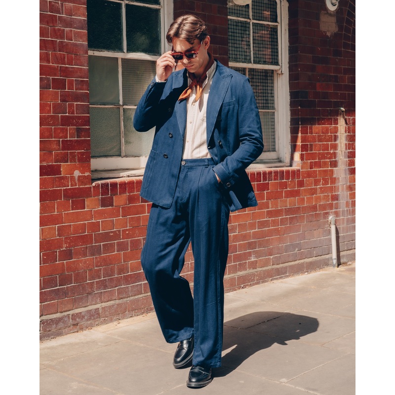 Crafted from a soft, lightweight blend of cotton and recycled cotton, this indigo-dyed suit pairs a double-breasted blazer with relaxed-fit trousers for a refined yet casual look. The blazer features a midweight herringbone weave that adds subtle texture, with an unlined construction, peak lapel, and soft shoulder rollmaking it ideal for spring and summer wear. The Morton trousers complement the jacket with a single-pleated front and a flattering straight-leg cut, offering comfort and ease of movement. Both pieces can be worn individually or together as a relaxed, modern suit.