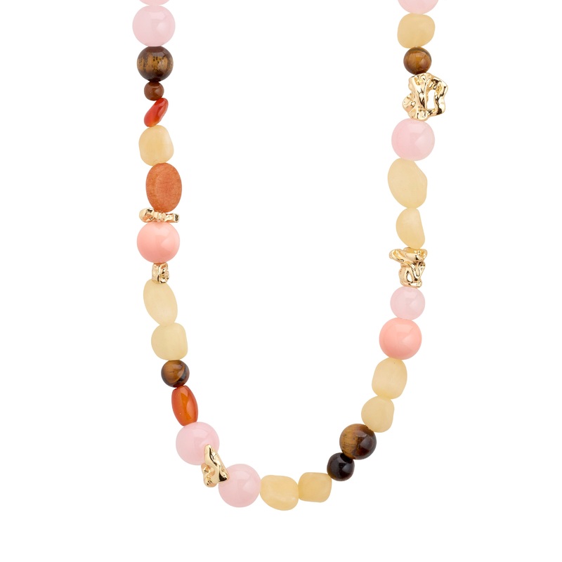 A reflection of natures beauty! The gold-plated DREAM necklace from blends genuine summer vibes with a variety of stones and glass beads. Featuring the exquisite semi-precious stones Topaz, red Agate, Tiger eye, and Lapis lazuli, it is inspired by the colo