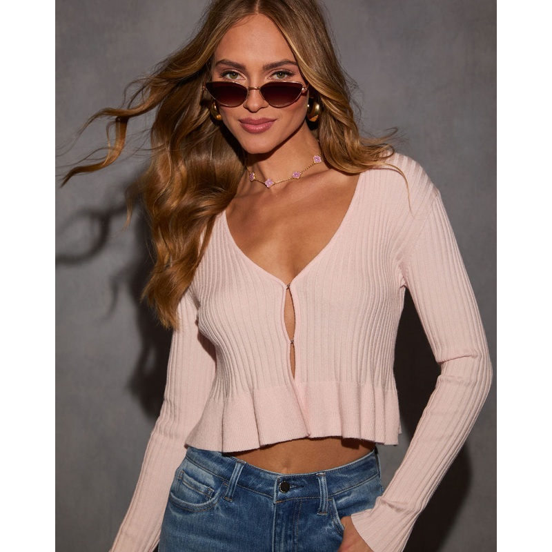 Slip into romance with the Dusky Rose Ribbed Peplum Cardigan, your perfect companion for a Valentines Day celebration or an effortlessly chic day event. Made from soft ribbed jersey fabric, this cardigan hugs your silhouette in all the right places, while
