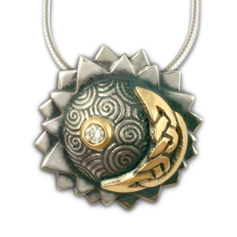 Sun and moon, conjunct, inspire this pendent, with a 2 mm diamond set among a swirling universe represents the morning star. Together, it symbolizes the coming together of opposites in harmony and beauty.