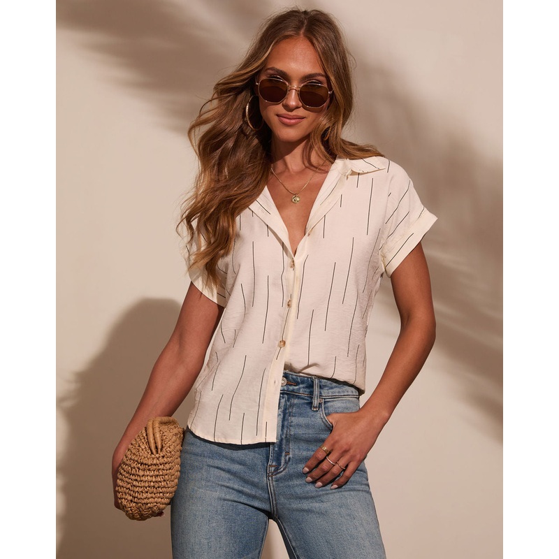 Whether youre enjoying a sunny brunch or exploring weekend markets, the Elianna Abstract Stripe Button Down Top ensures you stay chic and comfortable. This eye-catching piece features a lightweight linen fabric adorned with a modern abstract stripe design,