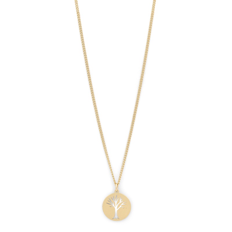 Wear natures beauty as ornament with this gold-plated necklace, where the beautiful silhouette of a tree serves as an elegant motif on the matte circle. The necklaces design is simple and stylish in a modern and Scandinavian style, while the little, refine