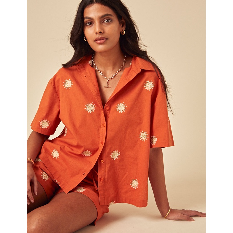 Designed in partnership with Elizabeth Scarlett, this limited-edition collaboration celebrates a love for colour, print, and embroidery, featuring motifs from her original watercolours applied to our iconic designs. This orange shirt with sunshine embroidery is here to shine. With a classic collar, button-down, and short sleeves, pair it with our matching shorts for the perfect look.