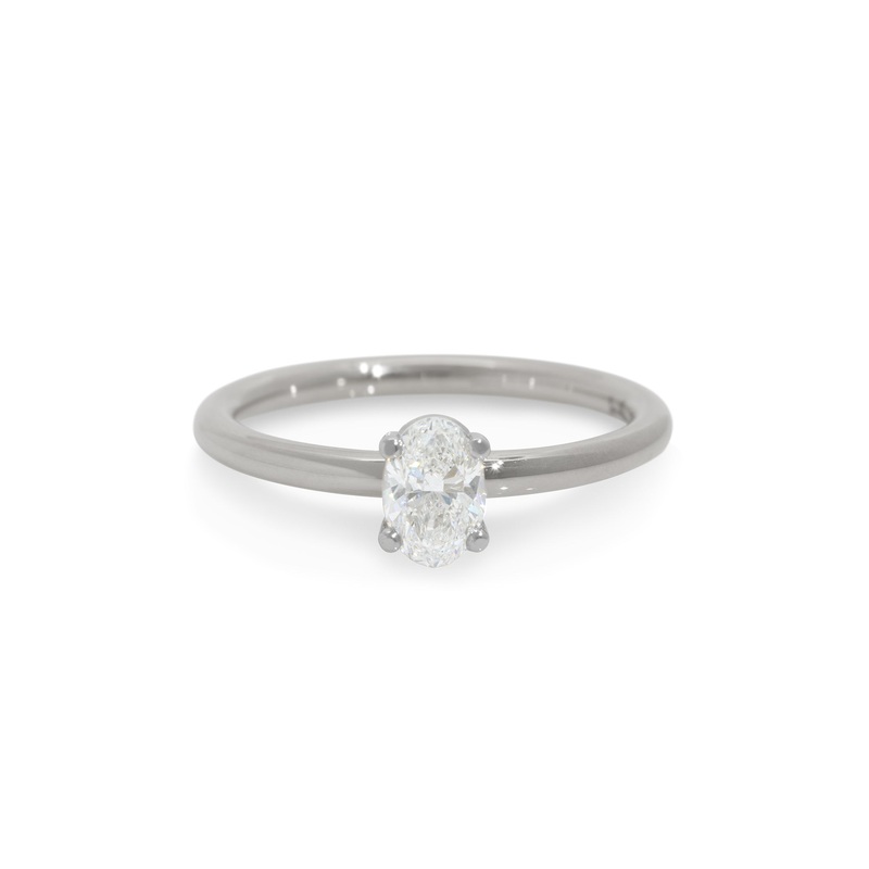 A solitaire design with a minimalist slim round band inwhite gold or platinum with an oval diamond in a four claw setting. It's all about the diamond with this one!If you desire a different gemstone, precious metal or price point please ask, we would love