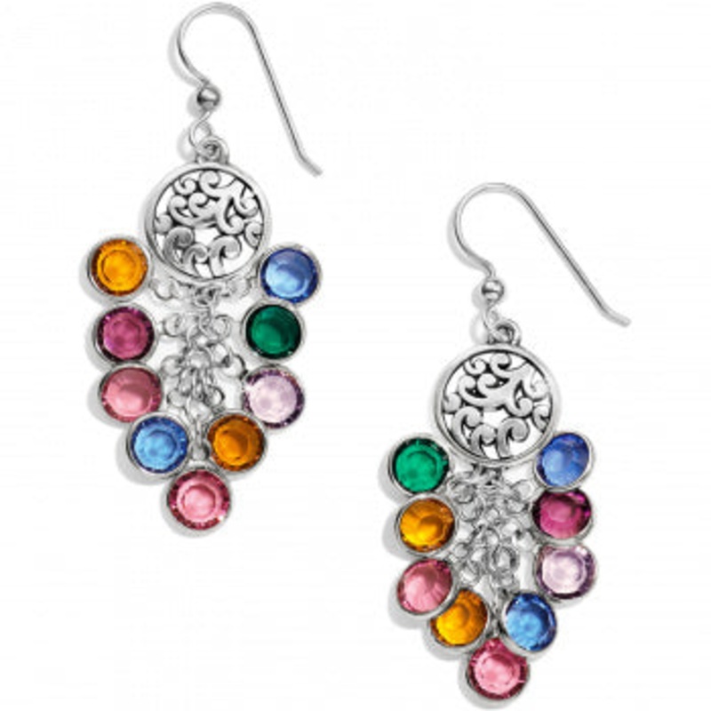 Scrolls contained within a circular medallion tell only half the story on these dangling drops — they’re finished with candy-hued crystals for a colorful effect.