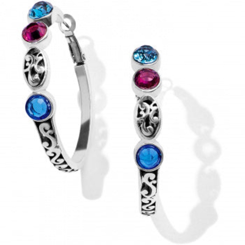 Colorful Swarovski crystals add so much color to your look with these feminine hoop earrings.Width: 1/4"Type: Post with flat disc backDrop: 1 1/2"Material: Swarovski crystalFinish: Silver plated
