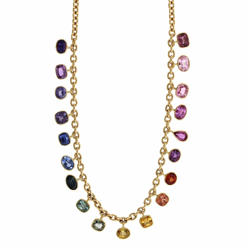 18k yellow gold necklace bezel set with multi shaped certified sapphires, one of a kind.