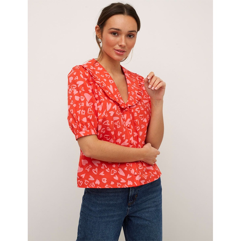 Reasons to love the Emmie blouse? It has a relaxed boxy frame and playful retro collar, and is reworked in orange and pink heart print fabric. We say team it with your favourite jeans.Ruffle-trim collarGathered sleevesButton front