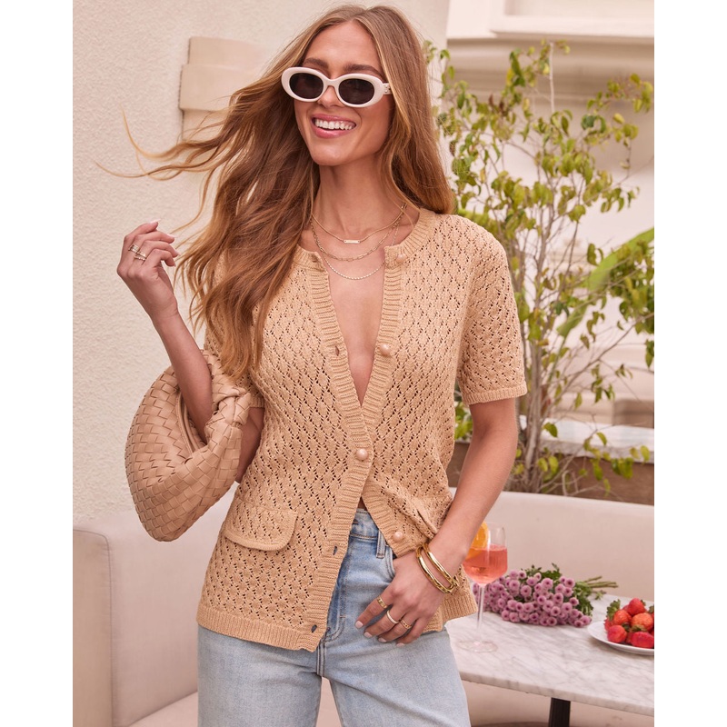 Relaxed yet refined, the Emogen Knit Button Down Cardigan is the effortless piece youll want to reach for again and again. Made from lightweight open knit fabric, this cardigan is perfect for layering while letting the springtime breeze in. The front butto