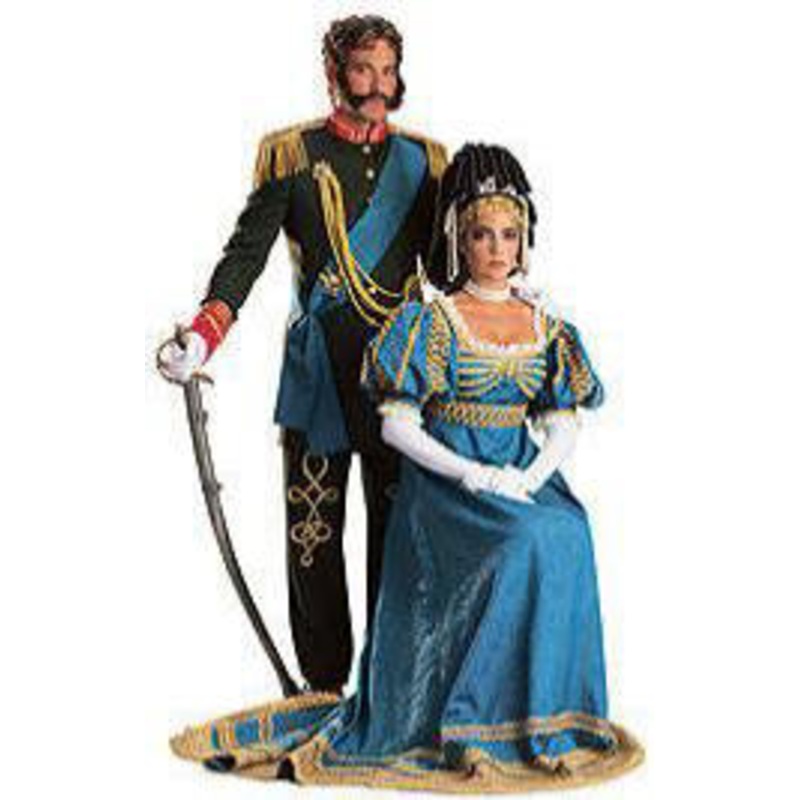 Includes: Satin gown with lace trimmed neckline, puff sleeves and flowing train. All heavily detailed with gold metallic trim.Color: As ShownSize: L (14-16)---------------------------------------------R90944 / R90942 (Czar) Sword and Headpiece not availabl