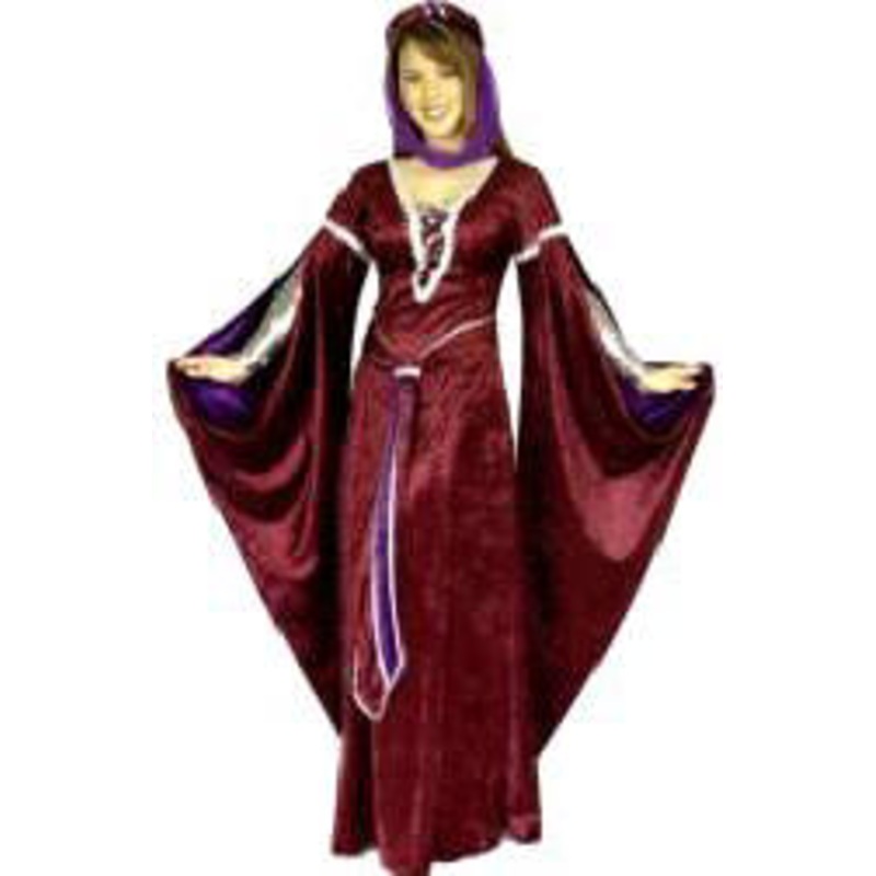 Very Good QualityIncludes: Panne Velvet gown with metallic trim & lame accent, matching renaissanceheadpiece & lame gloves.Color: Dark Wine/Purple, Evergreen/Wine, Purple/Wine, Black/PurpleSize: XS (3-5), S (5-7),M (8-10), L (11-13), XL (14-16)