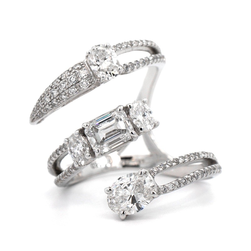 18k white gold ring featuring 3 rows of emerald cut, oval, and round diamonds.