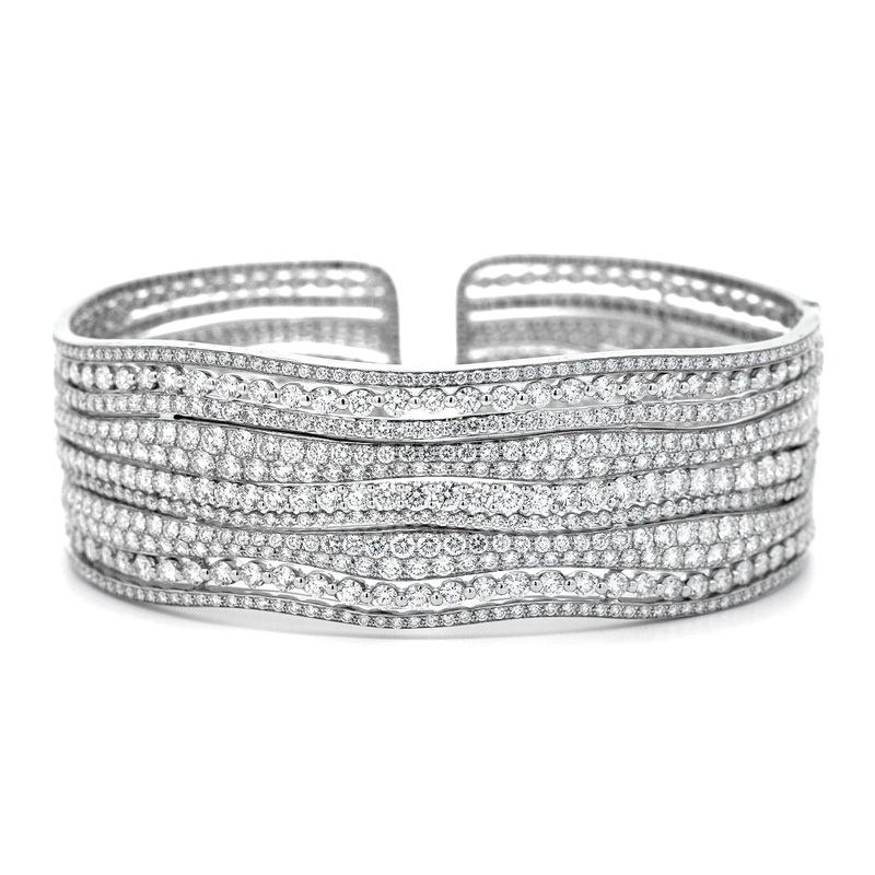 18k white gold multi row cuff bracelet featuring pave set diamonds.