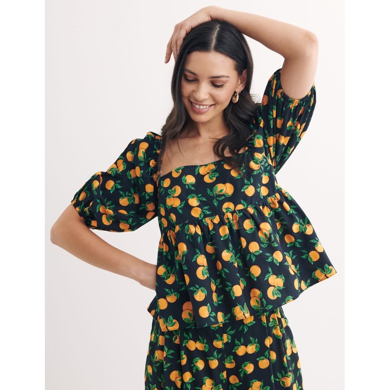This Eugenia blouse is designed with an airy fit and billowing design that's on-trend for the season. It features voluminous sleeves and a miniature bust with shirring on the back. Covered in a zesty orange print, it pairs perfectly with the matching trous