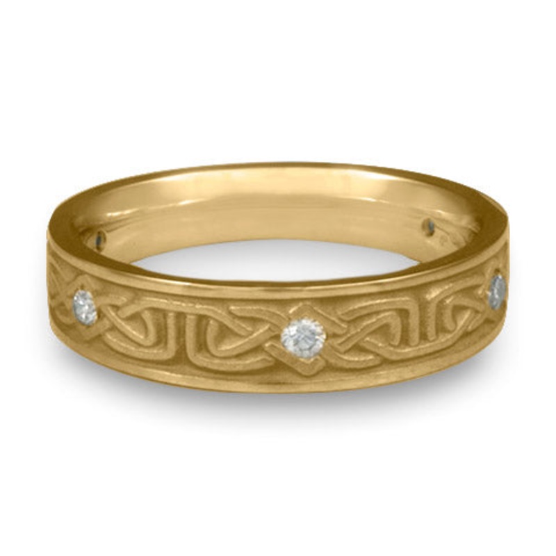 This Extra Narrow Labyrinth with Diamonds Wedding Ring in 14K Yellow Gold by Katherine Aberle is made with eco-friendly methods using recycled 14K Yellow Gold. It is sent to you via free Fedex ground shipping. This ring is available in sizes ranging from size 5 through size 12. Other sizes may also be available. Please inquire by telephone for pricing on these.