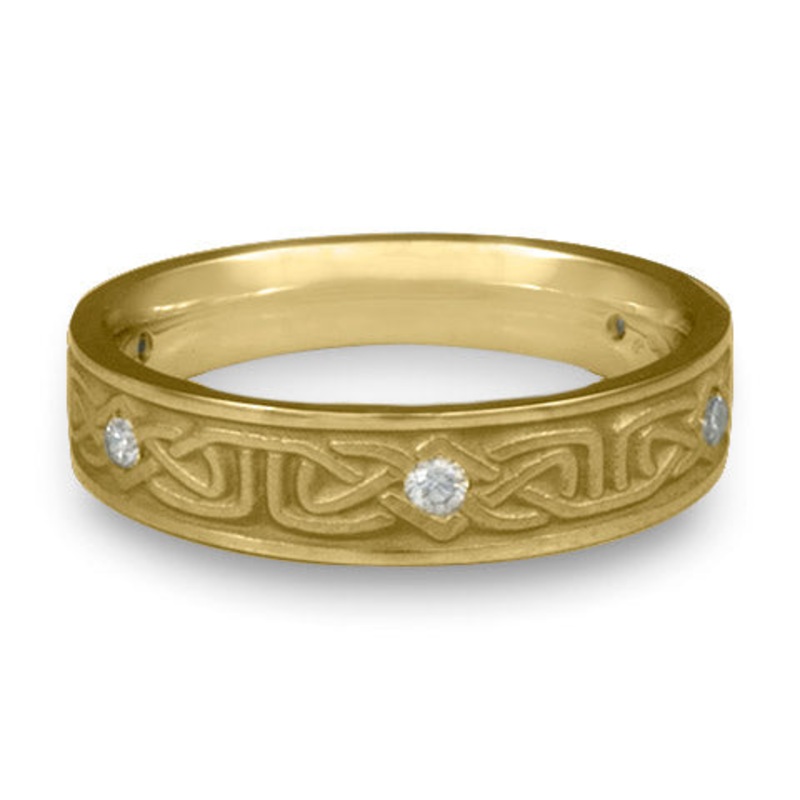 This Extra Narrow Labyrinth with Diamonds Wedding Ring in 18K Yellow Gold by Katherine Aberle is made with eco-friendly methods using recycled 18K Yellow Gold. It is sent to you via free Fedex ground shipping. This ring is available in sizes ranging from size 5 through size 12. Other sizes may also be available. Please inquire by telephone for pricing on these.