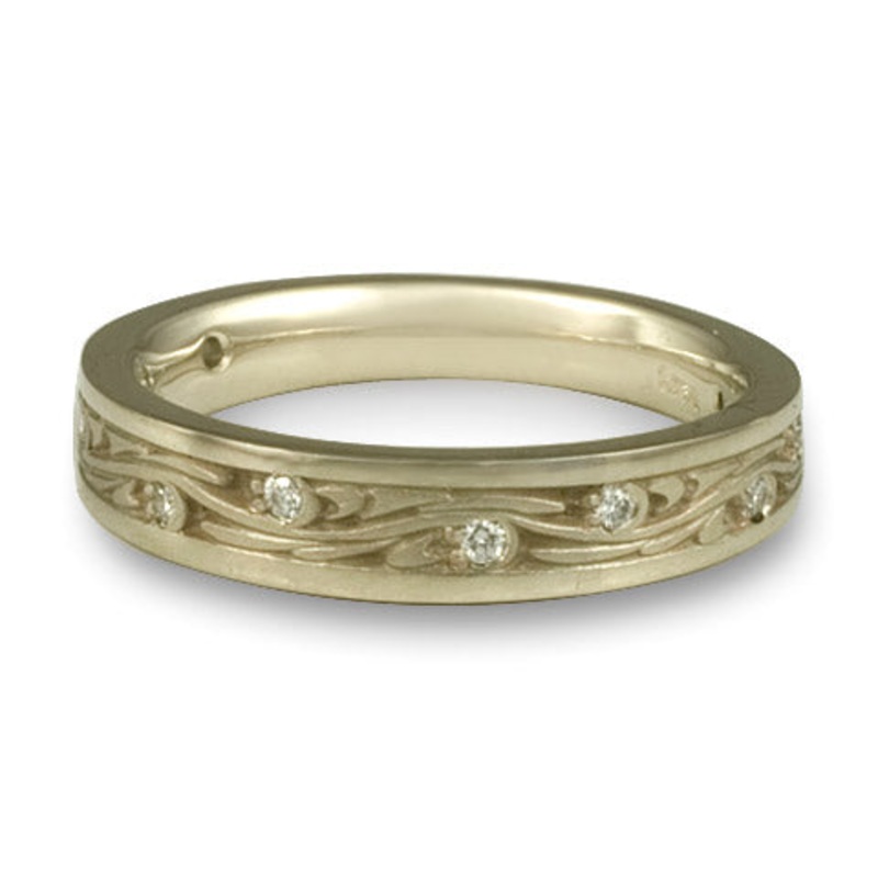 This gold wedding ring, reminiscent of the Van Gogh painting by the same name, has symbolism that suggests fluid movement, the ease of water curving through earth, or clouds in the night sky sparkling with stars. To us, the ring symbolizes a relationship intimate with the movement of all things; a relationship as full of possibility and inspiration as the play of form and emptiness.