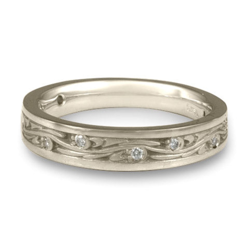 This Platinum wedding ring, reminiscent of the Van Gogh painting by the same name, has symbolism that suggests fluid movement, the ease of water curving through earth, or clouds in the night sky sparkling with stars. To us, the ring symbolizes a relationship intimate with the movement of all things; a relationship as full of possibility and inspiration as the play of form and emptiness.