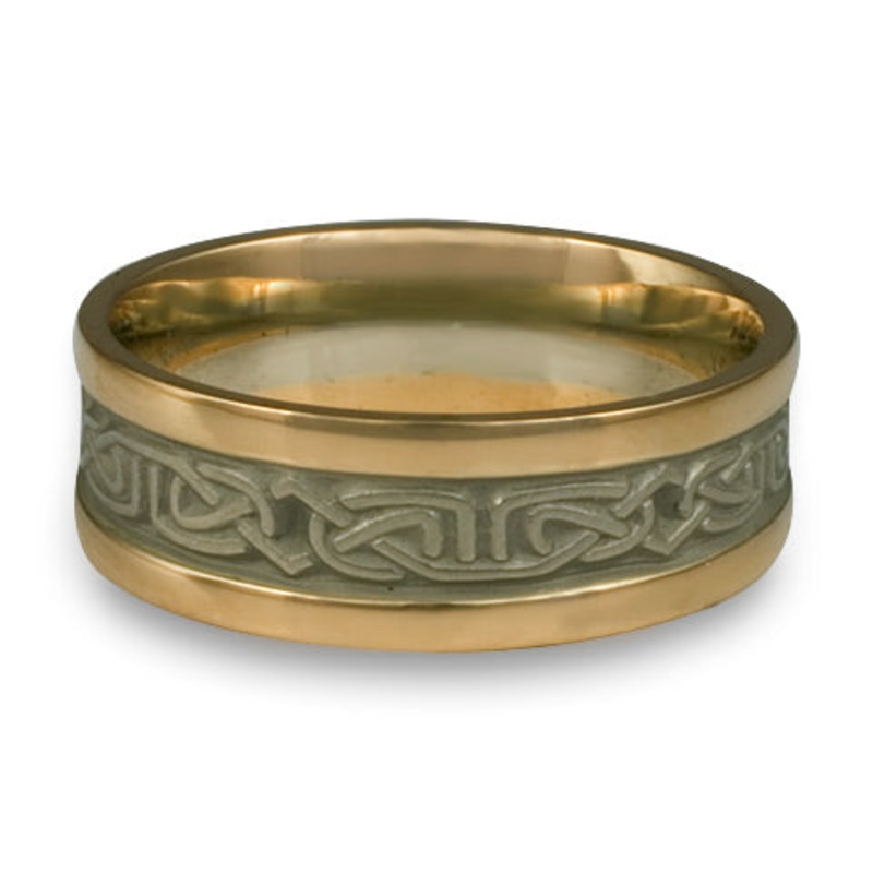 Symbolic Meaning: This is perhaps the most intricate of all the wedding ring knots, so it is appropriately called the Labyrinth. Those who are drawn to this ring have a love of complexity or mystery. If you look closely, there is hidden intention in the twists and turns of the individuals who join together in this pattern. Circles, which symbolize balance in relationship, become growth spirals. These are transformed into triangles, shooting upward and downward, into the heavens and into the earth. There is creative ebb and flow. In ancient times labyrinths were created, and people walked them in order to find direction in their live’s an attempt to locate the center of the labyrinth, which is metaphorical of one’s own inner and mysterious center.