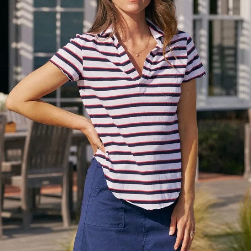 Frank & Eileen Charlotte Polo in red navy and white. Charlotte is our modern interpretation of a collegiate classic. Designed for a loose fit.Runs small, if in doubt size up.Heritage Jersey, 100% CottonWeve given this collegiate classic a fresh contemporar