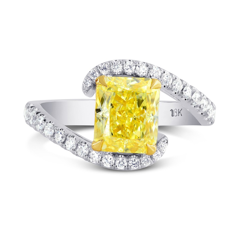 A cross-over pave solitaire diamond ring setting, featuring a fancy intense yellow radiant diamond center stone. Mounted in 18K white & yellow gold.