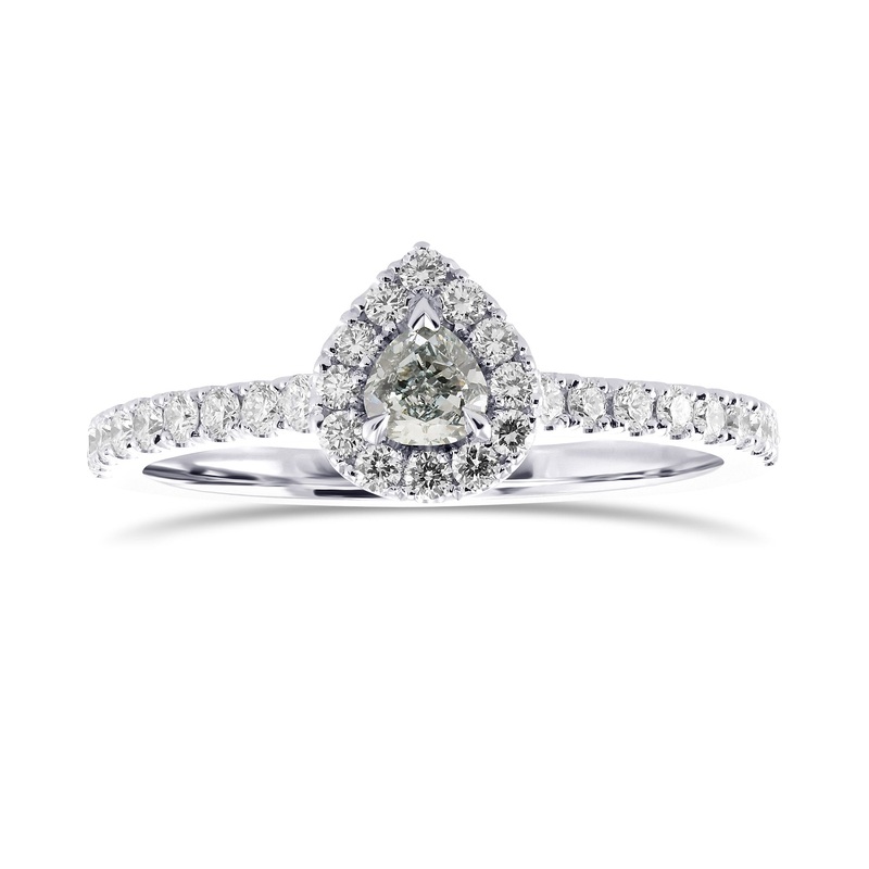 A fabulous Fancy Light Bluish Green heart shape diamond halo ring, with a center diamond weighing 0.18cts and certified by GIA. The ring, which is mounted in 18K white gold, features collection color brilliants styled in an open pave halo, with side stones along the shank.