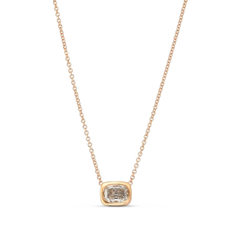 A classic fancy light gray cushion solitaire diamond pendant, with a center stone weighing 0.51cts and certified by GIA. The diamond is styled in a bezel setting and mounted in 18K rose gold.