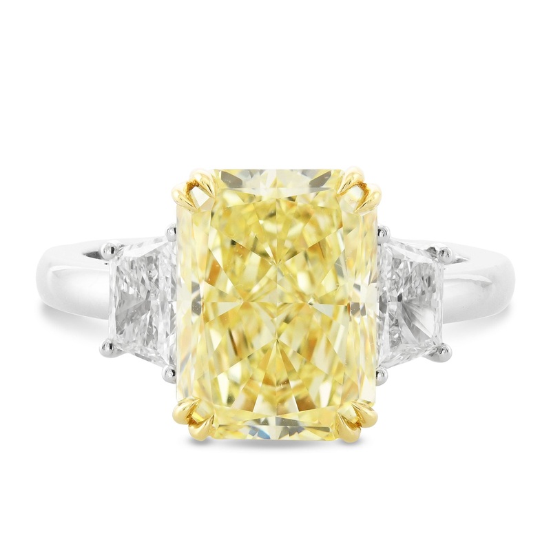 This fabulous fancy light yellow radiant three-stone diamond ring features a 3.78ct center stone certified by GIA. Flanked by collection color trapezoid diamonds, its set in a luxurious platinum and 18K yellow gold band. A true statement of elegance and beauty.