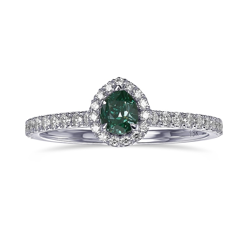 A classic fancy vivid bluish green pear halo diamond ring with a center stone weighing 0.39cts and certified by GIA. The diamond is accented with collection color brilliants styled in an openpave with side stones along the shank. The ring is mounted in 18K white gold.