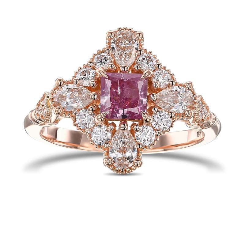 A stunning and extraordinary fancy vivid purplish pink princess diamond ring, with a center stone weighing 0.68cts and certified by GIA. The ring, which is mounted in 18K rose gold, features collection color pear and brilliant diamonds, styled in shared prong floral halo motif with small brilliants accenting the shoulders and bridge.