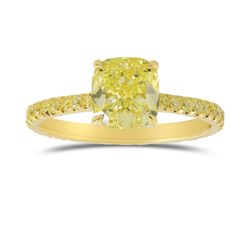 A fabulousFancy Yellow Cushion Side Stone Diamond Ring with a center GIA certified 1.80cts diamond, set in a Prong setting, with 34 Brilliant cut Fancy Yellow diamonds set along the shank in an Open Pave design. The ring is mounted in 18K Yellow Gold.