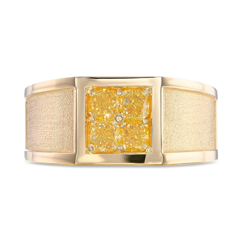Custom made men's ring set with 4 fancy yellow radiant diamonds weighing 1.02cts, total weight. Mounted in brushed 18K yellow gold. Color and clarity graded by our in house GIA GG graduate gemologist.