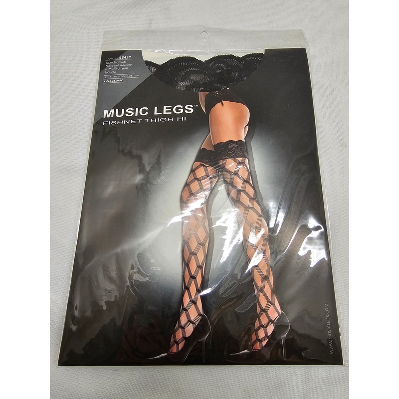 Music Legs Fishnet/Fencenet Thigh HighSpandex multi fence net stocking with silicon grip lace top.Size: 5'-5'10" / 100-175lbsColor: BlackSH45437 O/S B