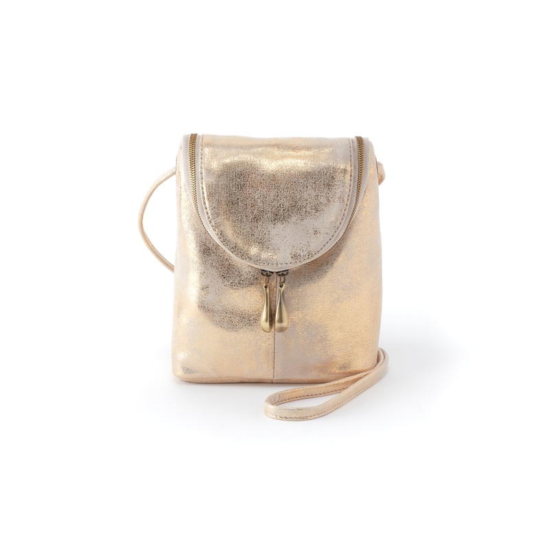 A best seller & Hobo icon, the Fern crossbody bag is the perfect small leather purse & has stood the test of time since first designed in 1991. Crafted in our new distressed gold metallic hide, this lustrous leather has a casual vibe and bright metallic shine.
