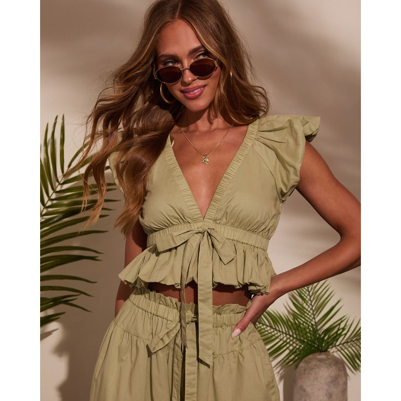 If youre ready to step into spring with style, slip into the Fern Ruffle Peplum Top. Made from lightweight poplin fabric, this top features an elastic neckline and waist trim for a comfy, flattering fit. The ruffle sleeves add a playful, feminine touch, while the peplum hem brings that perfect balance of relaxed and chic. Whether you’re pairing it with denim or the matching Fern Waist Tie Wide Leg Pants, this top is all about easy elegance.