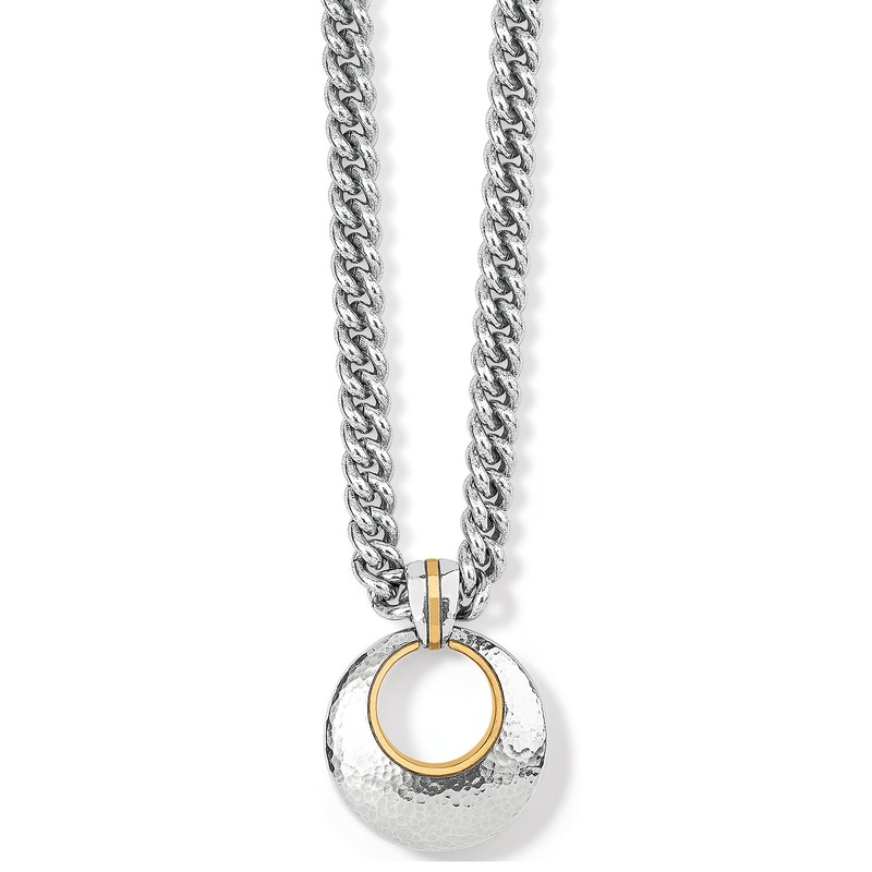 This pendant necklace with softly hammered details and golden accents is modern art-to-wear breathtaking from every perspective.