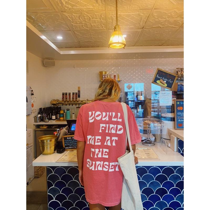 faded coral tee with youll find me at the sunset printed on the back & sunset chasin printed on the front with a sun!