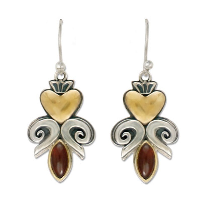 These bold earrings featuring a fluer de lis motif and a beautiful golden heart were designed by our lead designer and co-owner of the company, Helen Chantler, for Valentine's day, 2014. The piece is accented by a marquis garnet, deep and passionately red,