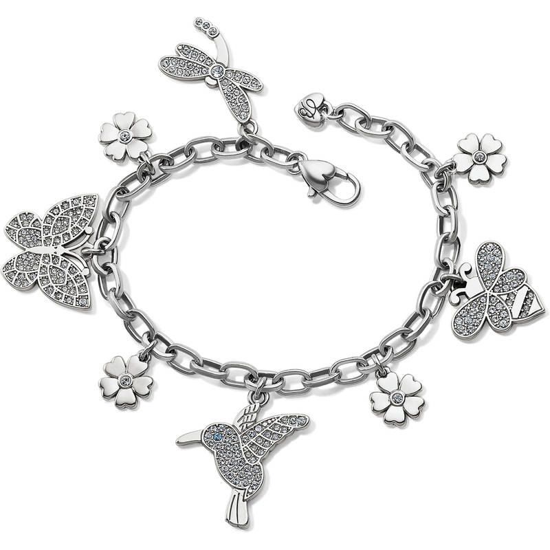 Along with a darling hummingbird, butterfly, bee, and dragonfly charms dangle from this silver chain bracelet, each one sparkling with Swarovski crystals.